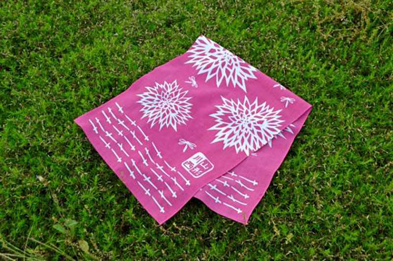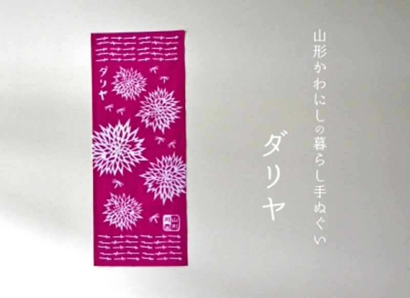 川西町の花として親しまれているダリアをモチーフに、深みのある紅色でシックに仕上げた一枚です。切り絵風のデザインがどこか懐かしく、落ち着いたレトロな雰囲気が漂う手ぬぐいは、普段使いはもちろん、贈り物としてもおすすめです。